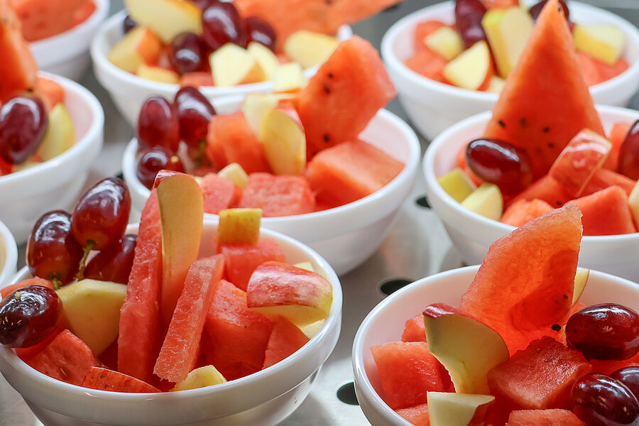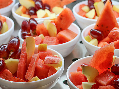 Außerdem findest du dort eine Auswahl an süßem Gebäck, frischem Obst und Sandwiches mit Gemüsespreads.
