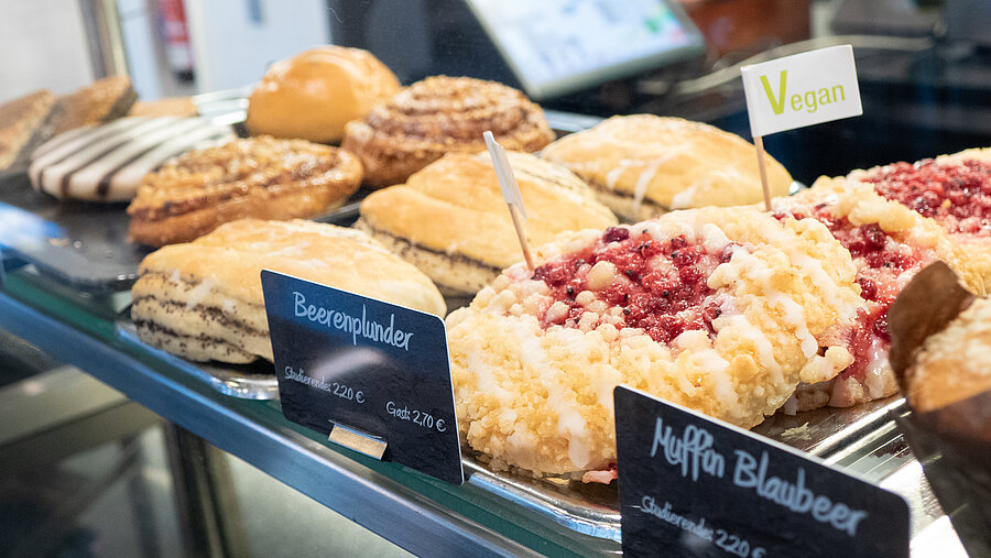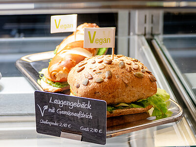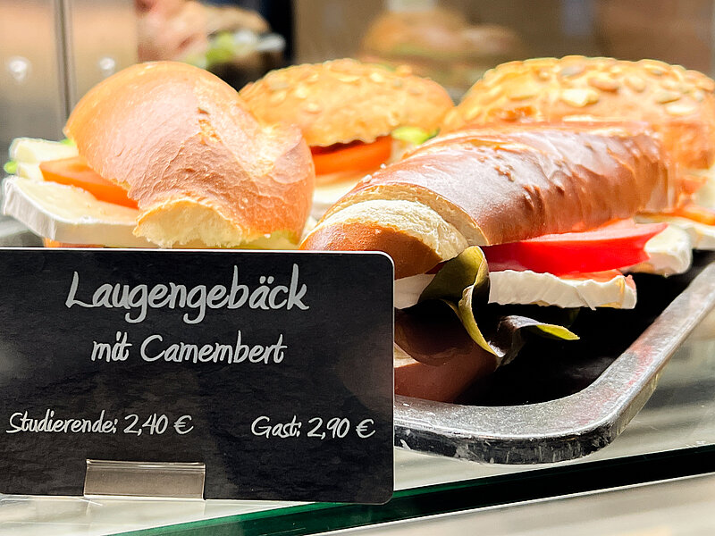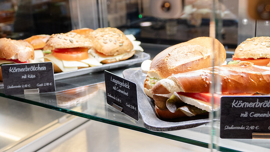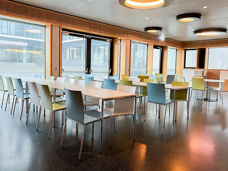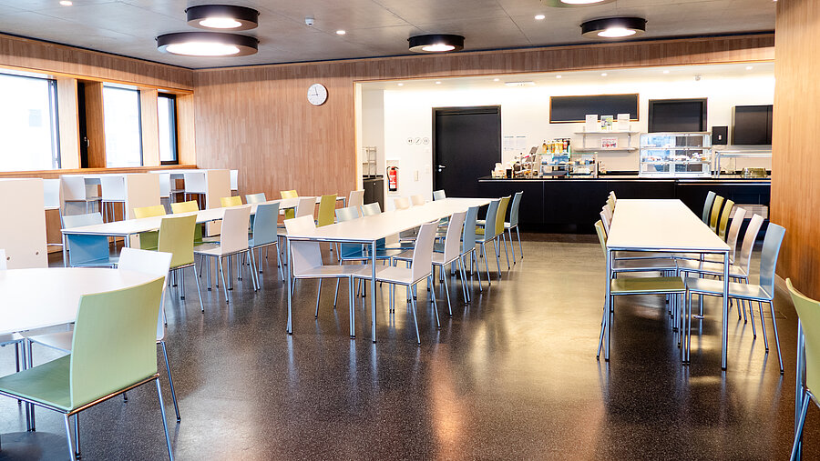 In der Evangelischen Hochschule befindet sich unsere Essensausgabestelle. Mittags werden hier täglich zwei verschiedene Gerichte — ein veganes oder vegetarisches Gericht und ein Fleisch- oder Fischgericht — angeboten, die von der Mensa Institutsviertel geliefert werden.
