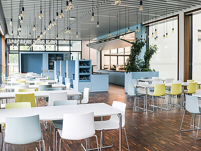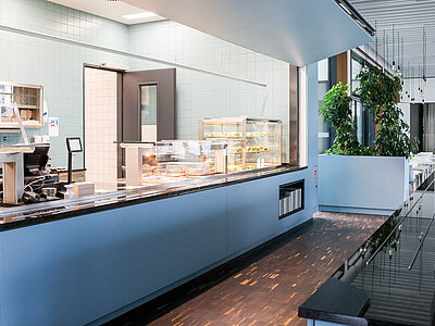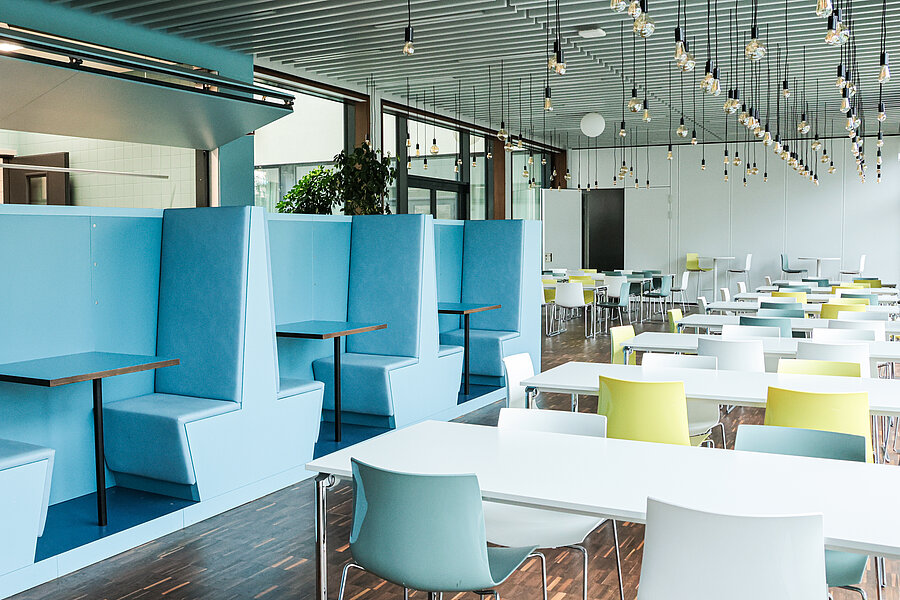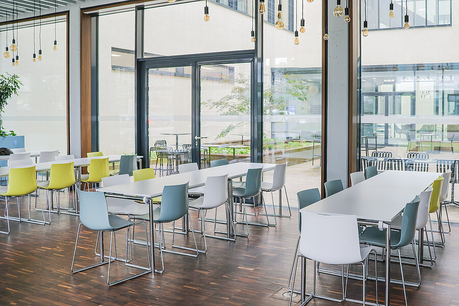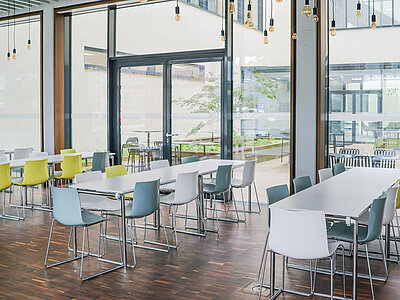 Im Fraunhofer-Institut befindet sich unsere Essensausgabestelle. Mittags werden hier täglich zwei verschiedene Gerichte — ein veganes oder vegetarisches Gericht und ein Fleisch- oder Fischgericht — angeboten, die von der Mensa Institutsviertel geliefert werden.