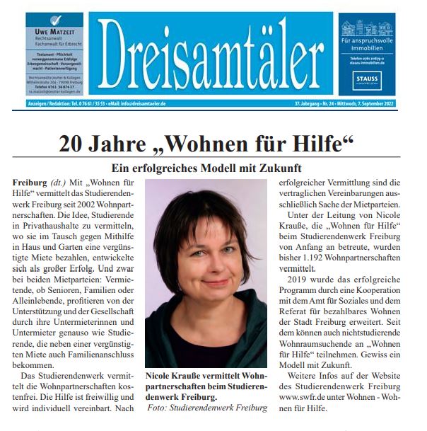 Das Studierendenwerk vermittelt diese Wohnpartnerschaften kostenfrei. Um in das Programm aufgenommen zu werden, wenden Sie sich bitte an Nicole Krauße, Kontakt s. rechts.