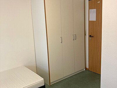 möblierte Zimmer mit Bett, Schrank, Schreibtisch und Stuhl